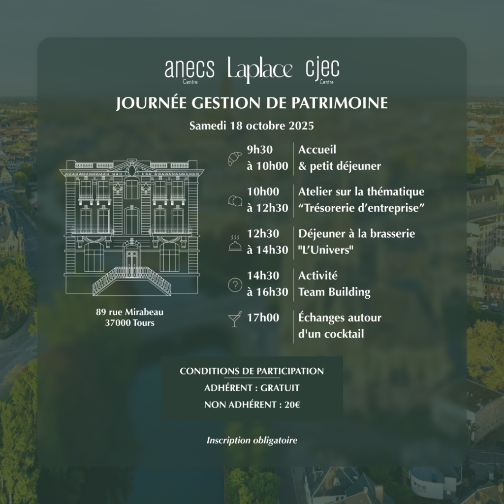 L’ANECS Centre et le CJEC Centre, en partenariat avec Laplace, vous invitent à participer à une journée exceptionnelle dédiée à la Gestion de Patrimoine.