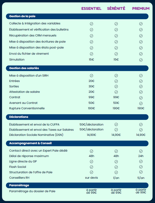 Nous proposons trois formules adaptées aux besoins des cabinets, avec des tarifs allant de 17,70 € à 32,90 € par bulletin et par mois, pour une gestion complète, flexible et optimisée de votre pôle social.